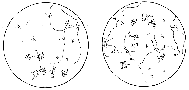 11. Germination on surface of plates. It is convenient for some purposes to germinate ascospores after they have been spread on the surface of prepoured 3% or 4% agar plates containing minimal medium N or other other, appropriately supplemented, medium. Percent germination can be determined easily and quickly. Most auxotrophs and some morphological mutants can be distinguished from their wild counterparts, and counted or isolated selectively. Ascospores are taken by loop from a cross tube to a drop of water in the middle of the 3% agar plate; the desired number (about 200 per plate) can be obtained by adding or removing spores while examining the drop at 40-60 X magnification under the dissecting microscope. Spores are distributed evenly over the plate, using a sterile glass spreader. Do not spread to the extreme edge. Avoid scratching the surface. If the germinating ascospres are to be scored but not picked, ascospores may be suspended in 0.15% agar and spread in narrow parallel streaks with a Pasteur pipette (Maling 1959 Stanford thesis).